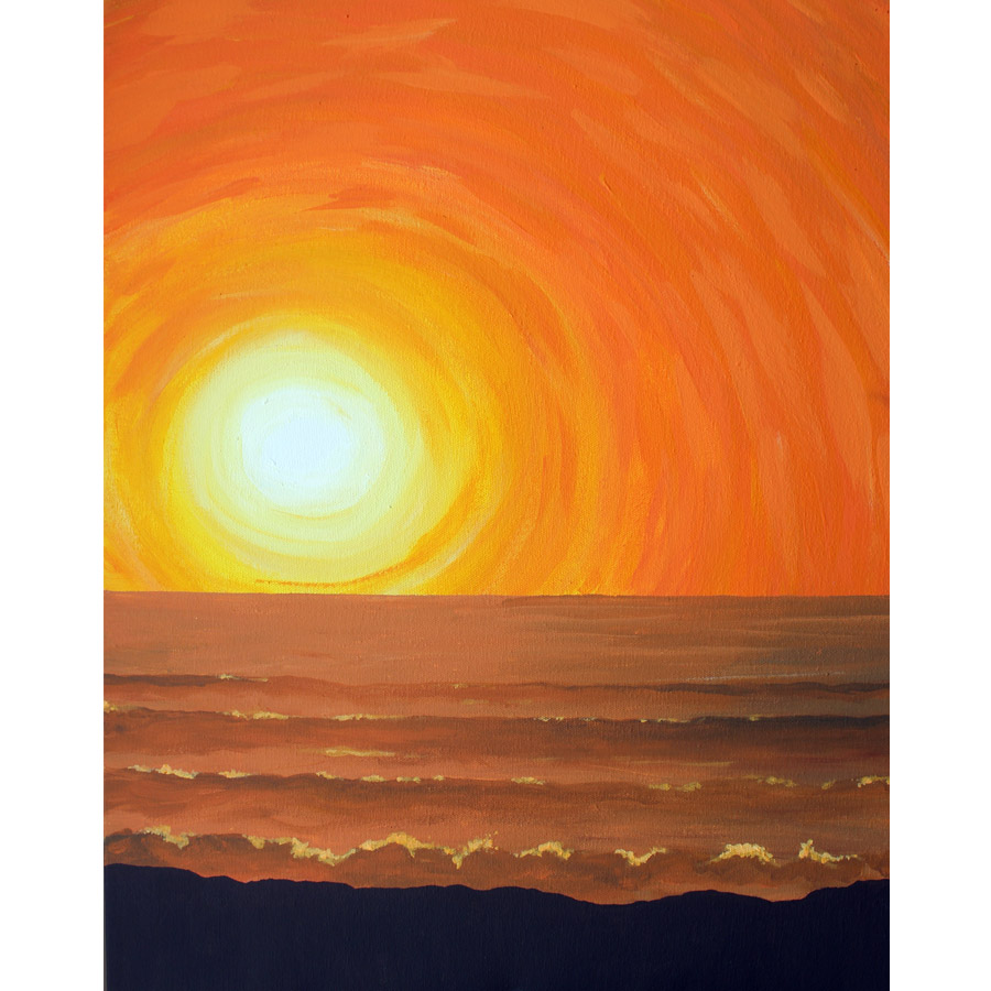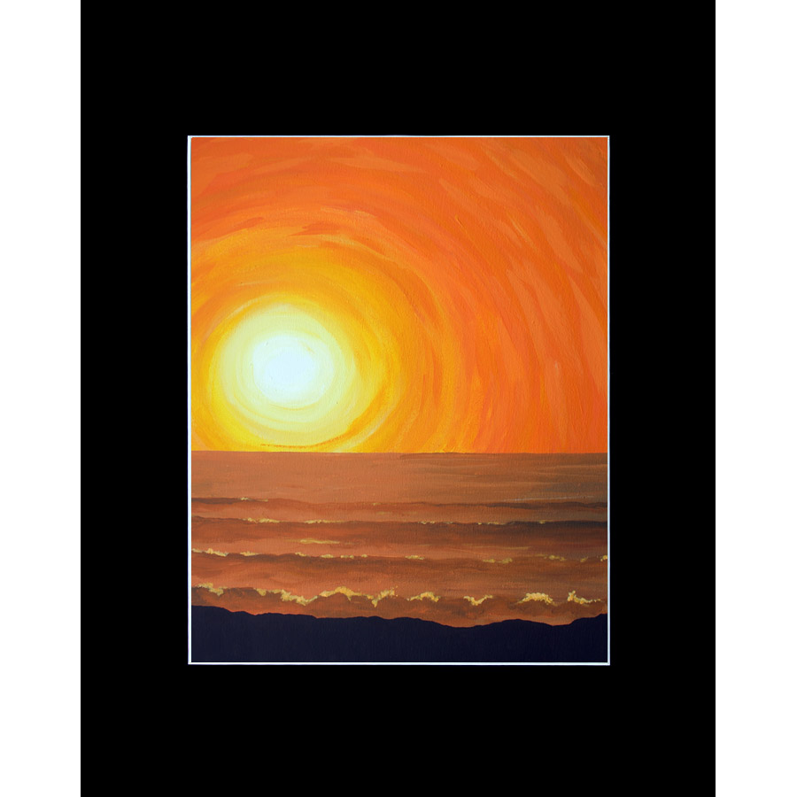 “Orange Sky Beach” depicts the ocean sky lit a brilliant orange just before sunset. It was a breezy summer day, kicking up mist from the ocean. A vibrant and brightly colored work, it adds an injection of color to decor, while still having a peaceful calm feeling.